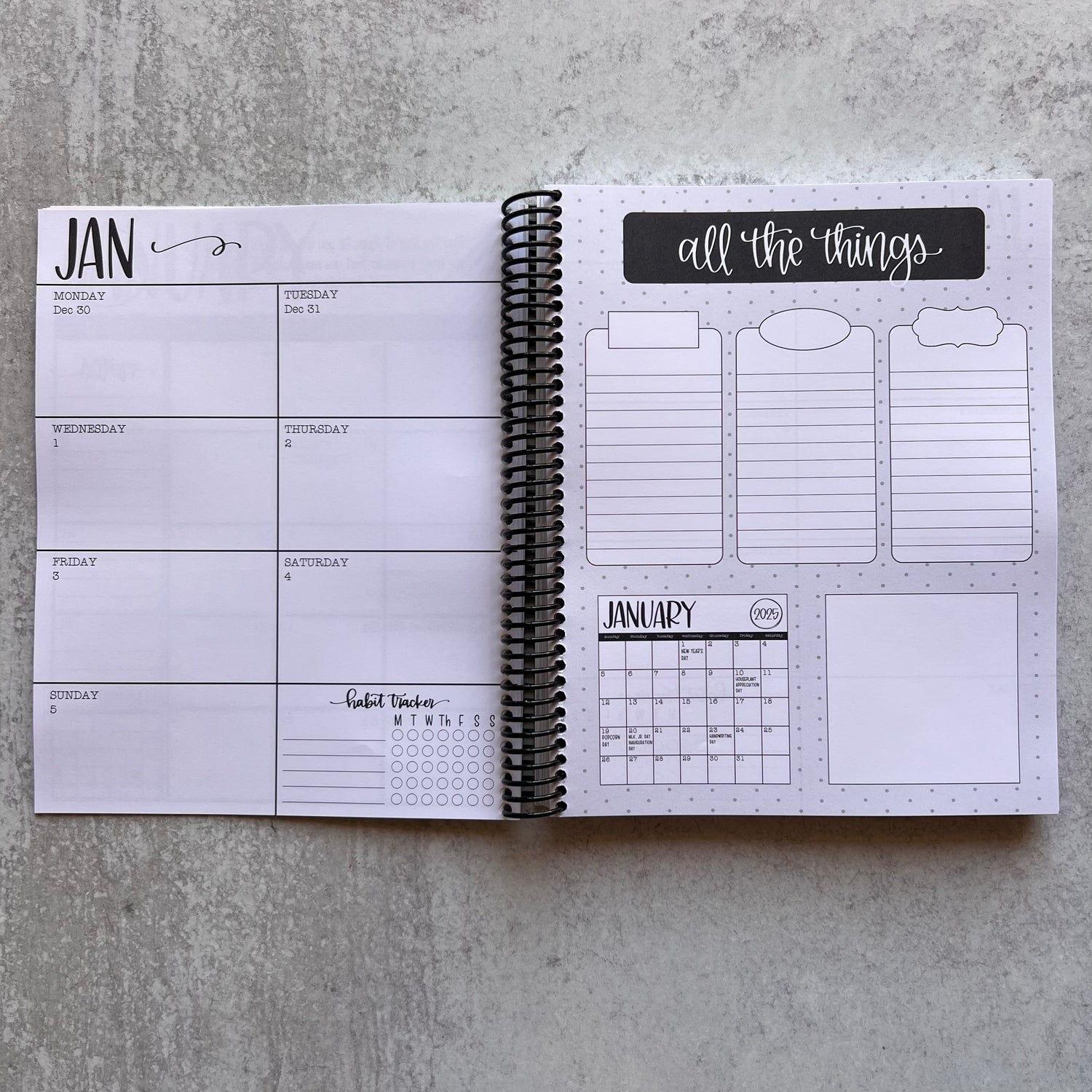 Manage all the details with this weekly planner that includes weekly and monthly layouts.
