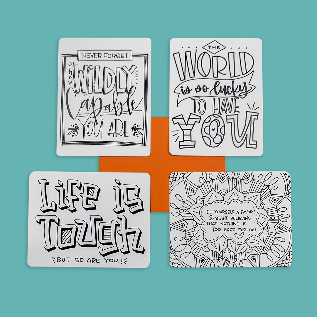 Eight (8) notecards and envelopes — two (2) of each of the four (4) designs pictured — to show your friends how much you care.