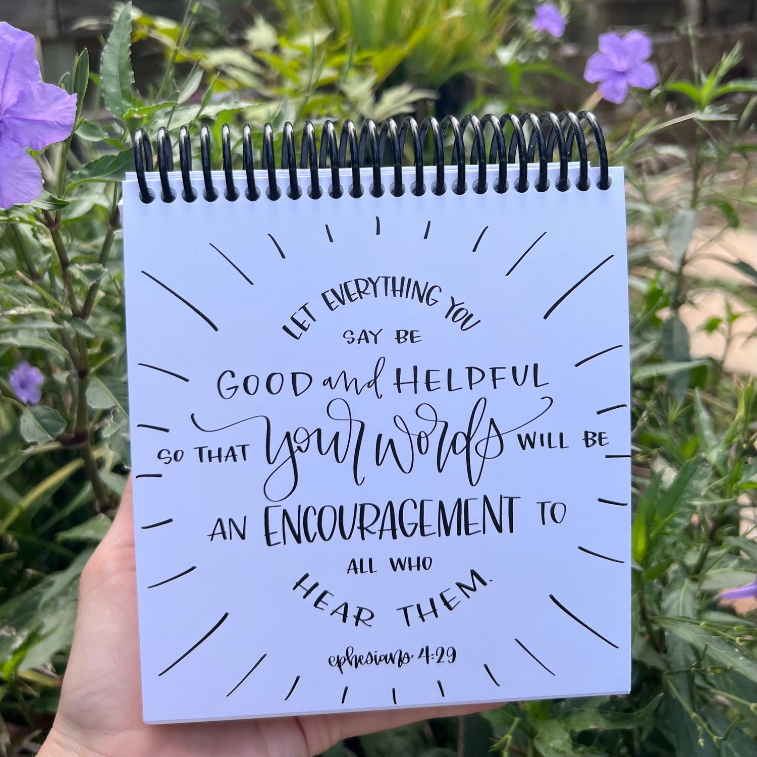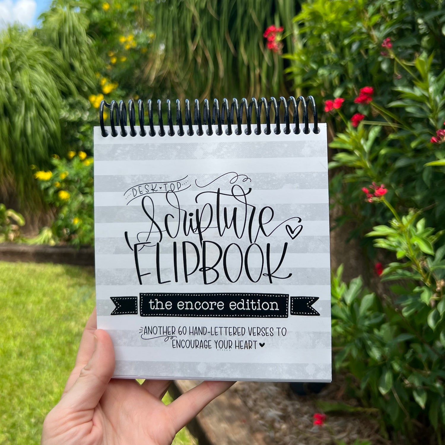 The Encore Edition is a second volume of my hand-lettered Scripture flipbook — filled with a fresh collection of encouraging Bible verses to inspire your heart every day.