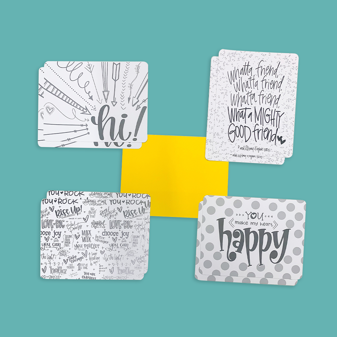 Eight (8) notecards and envelopes — two (2) of each of the four (4) designs pictured — to send anyone and everyone some happy mail.